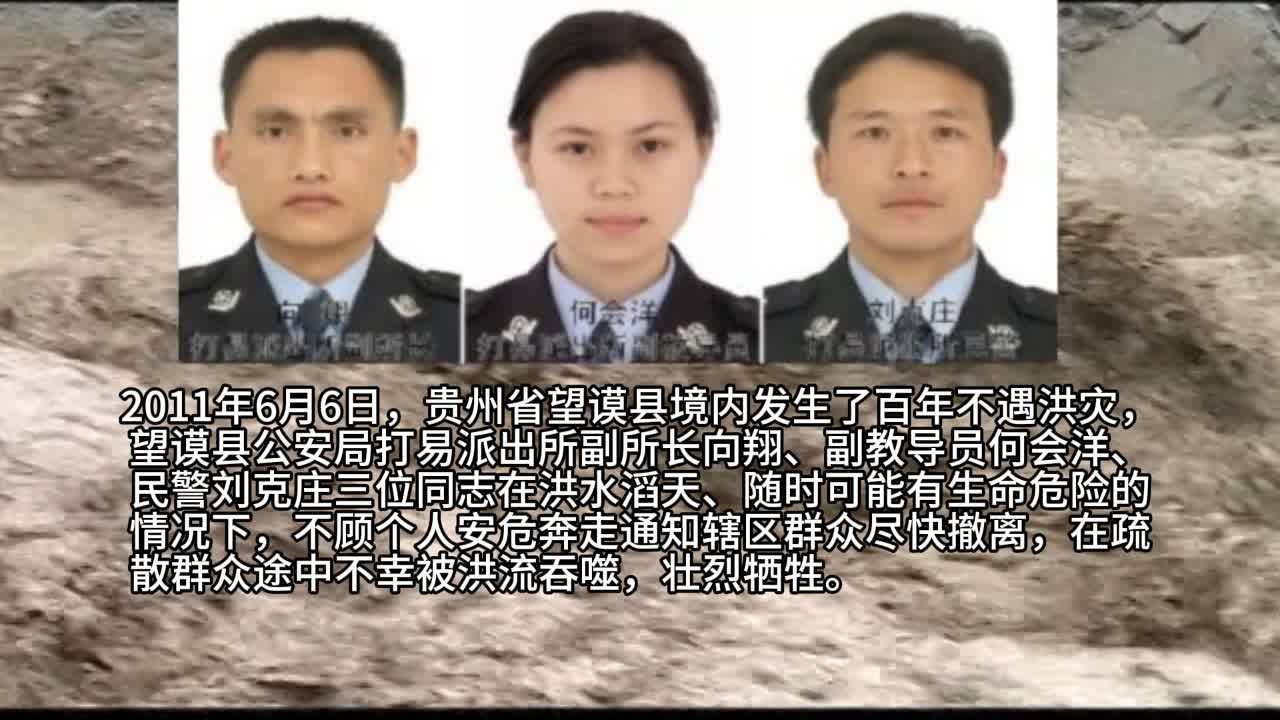 2011年6月6日,贵州省望谟县境内发生了百年不遇洪灾,望谟县公安局打易派出所副所长向翔、副教导员何会洋、民警刘克庄三位同志在洪水滔天、随时可能有生命危险的情况下,不顾个人安危奔走通知辖区群众尽快撤离,在疏散群众途中不幸被洪流吞噬,壮烈牺牲。平均年龄仅30岁的三位共产党人,以他们年轻的生命,谱写了一曲忠诚的赞歌。