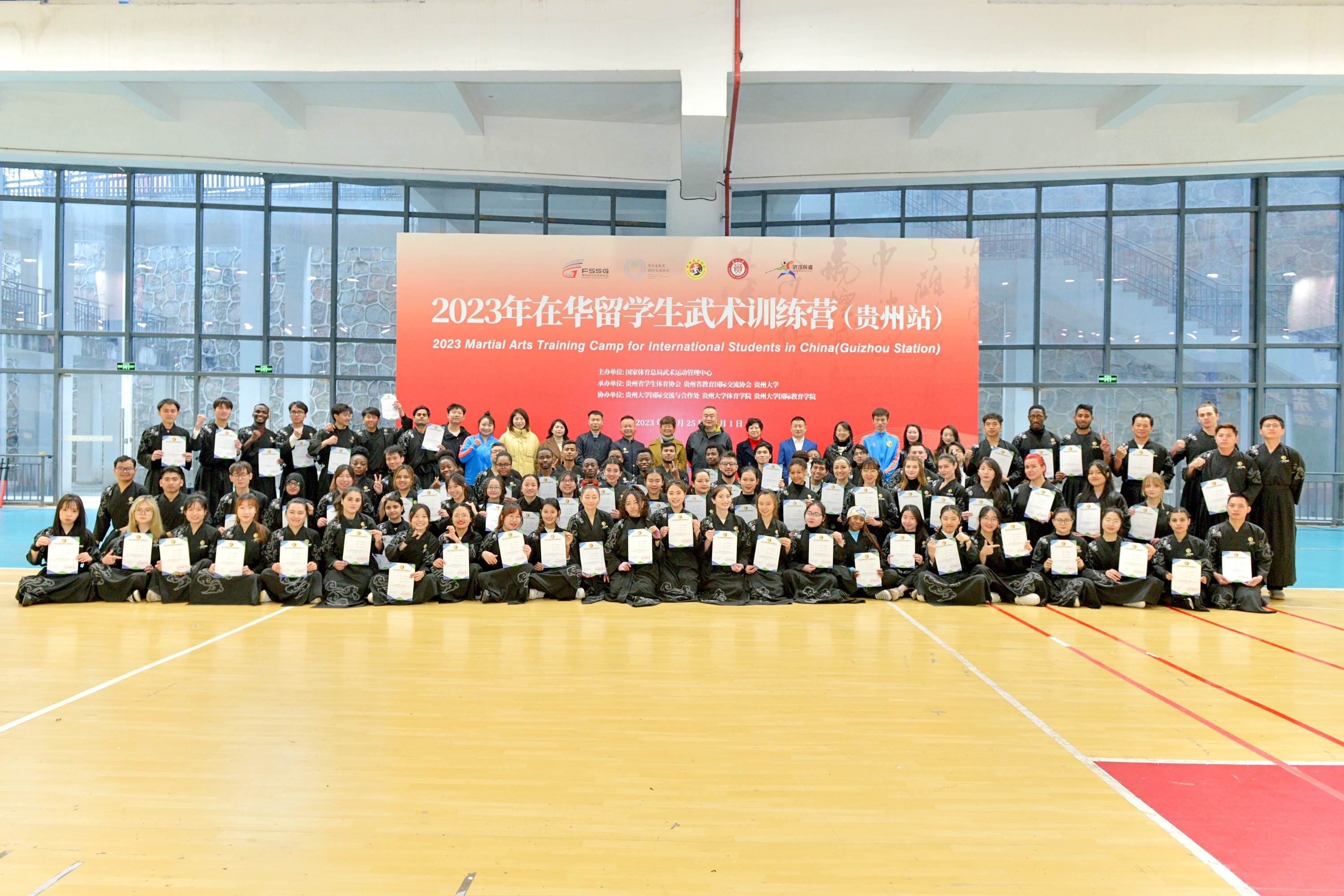 日前,由国家体育总局武术运动管理中心主办,贵州省学生体育协会、贵州省教育国际交流协会、贵州大学承办的在华留学生武术训练营(贵州站)在贵州大学圆满闭幕。本次训练营由贵州大学、贵州民族大学、贵州财经大学、贵州理工学院选派来自亚洲、非洲、北美洲、南美洲等20多个国家120多名留学生参加。