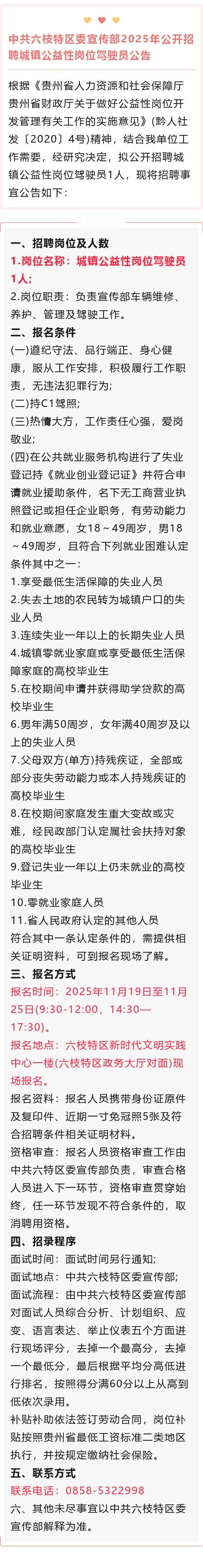 【政府机关】中共六枝特区委宣传部招聘驾驶员!18-49周岁可报!