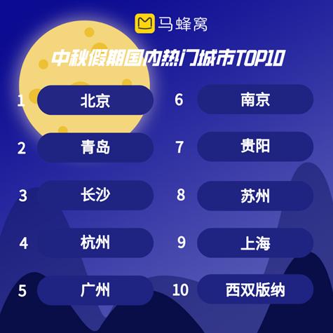 ▲马蜂窝旅行玩乐大数据显示,北京、青岛、长沙、杭州、广州、南京、贵阳、苏州、上海、西双版纳位列今年中秋小长假关注度最高的城市前十,其中,青岛、长沙、贵阳、苏州等地都是凭借美食实力上榜。