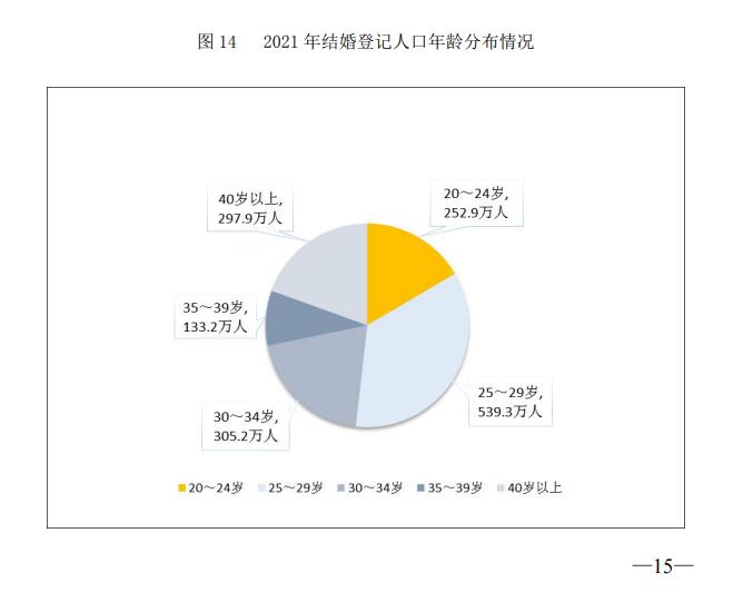 ▲民政部消息,2021年,全国全年依法办理结婚登记764.3万对,比上年下降6.1%。从2021年结婚登记人口年龄分布情况来看,25-29岁年龄段最多。