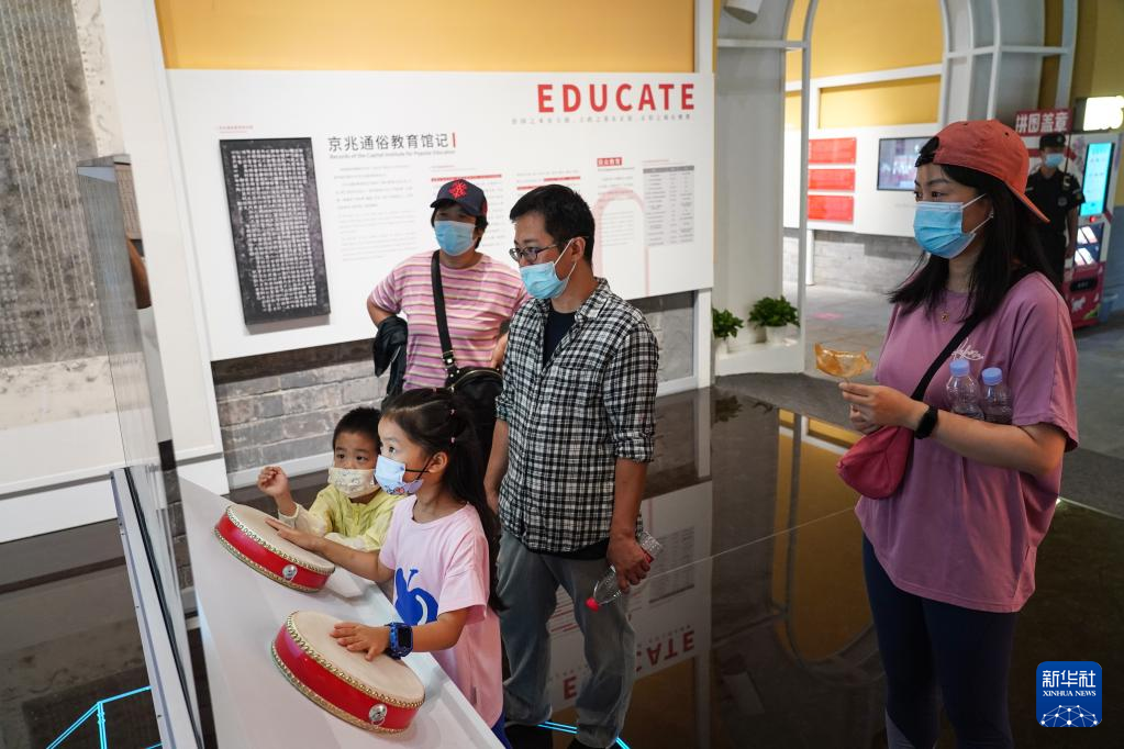 8月28日,儿童在北京鼓楼一层体验击鼓。新华社记者 陈钟昊 摄