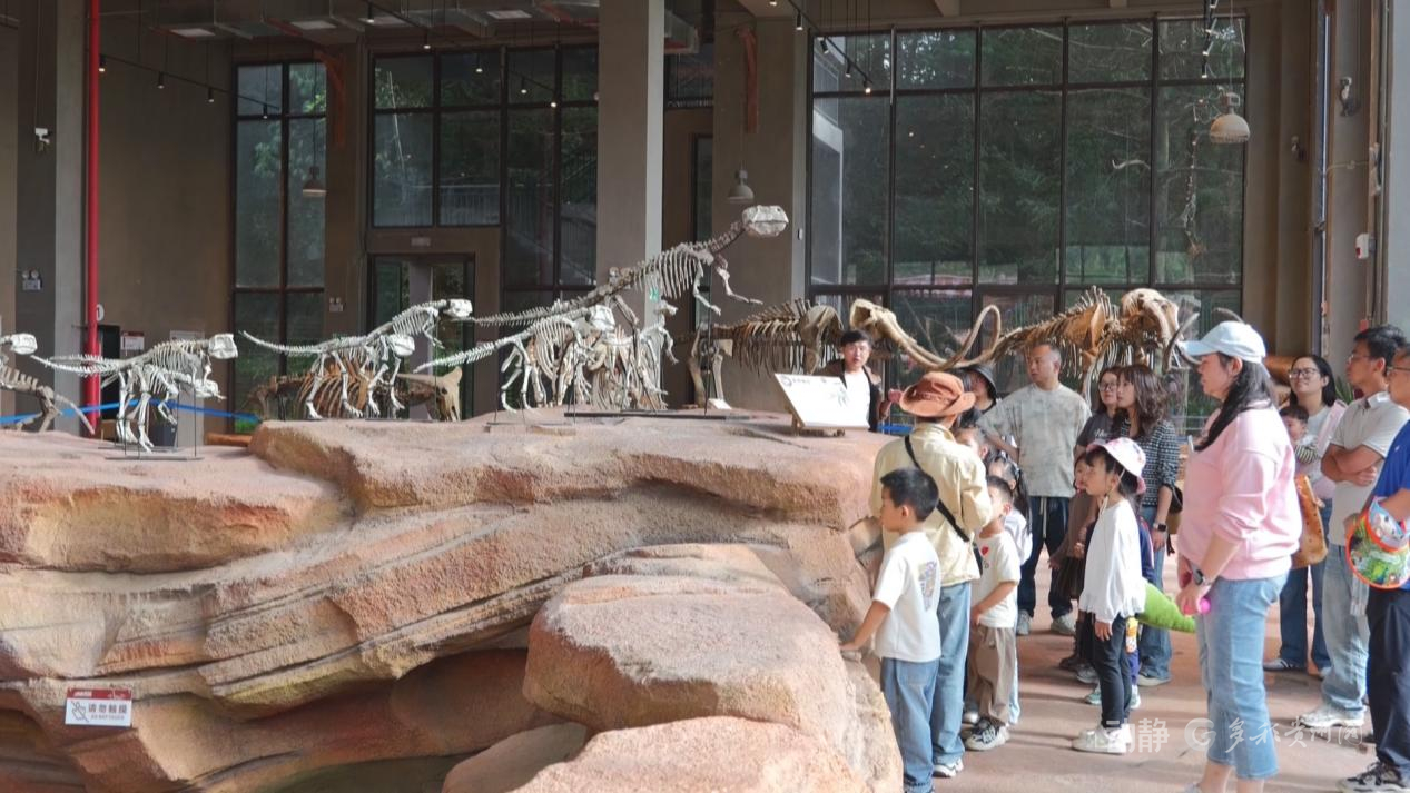 除了模拟考古挖掘,园区内的古生物化石科普馆里还“藏”有近1000件真化石,从远古海洋生物到早期鸟类都有,家长和孩子们可以在这里近距离观看、亲手触摸1亿年前的骨骼化石,感受地质变迁的奥妙。同时,为了让大家看懂“门道”,国庆期间科普馆还增加了义务讲解场次,从平时每天3-4场增加到了8-10场;“恐龙小课堂”也从平时的每天2场增加到了每天4场。