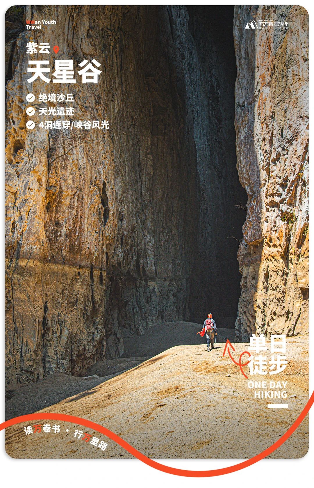 天星谷是一个集自然景观、洞穴探险和徒步旅行于一体的旅游胜地。这里以其独特的沙丘、清澈的玻璃水洞穴、壮观的钟乳石洞而闻名,吸引了众多游客前来探访,被徒步爱好者和探险者誉为贵州版的“沙丘”场景。