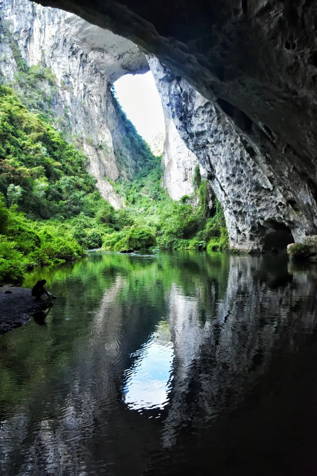 大圣之眼的奥秘藏在深谷的湖泊与远处的高山之间。在喀斯特作用的鬼斧神工下,山体被开了一道口子,独特的天坑与静谧的湖水倒影在白日的映照下,像极了那位西天而来的故人——孙悟空。