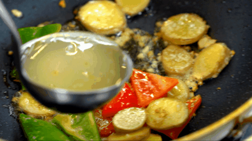 姜片加油爆香,然后加入黄油翻炒融化,继续加入蒜末、彩椒翻炒香,然后放入提前熬制好的鸡高汤煨煮。