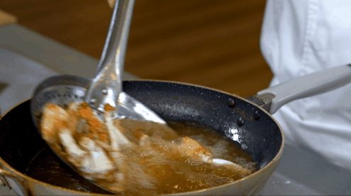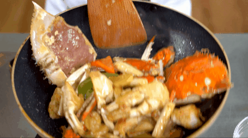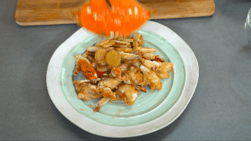 在爆炒之前,蟹肉的切口还得沾生粉煎炸,这样能有效锁住蟹肉里的汁水,炒出来的蟹肉会更鲜嫩多汁。