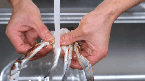 处理干净的梭子蟹切掉蟹腿没肉的部分,再对半切开,处理蟹钳上的倒刺,然后用刀背拍到有点裂开,最后用厨房纸巾将处理好的蟹肉吸干水分。