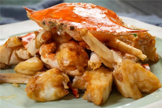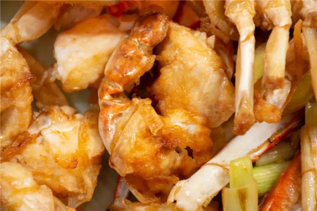 肥美的梭子蟹外壳被炸得脆脆的,泛着金灿灿的油光,很是诱人,用大量的葱蒜一起翻炒后,每一块螃蟹都很入味。