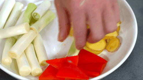 姜切片,小京葱切段,切成5厘米左右的长度,彩椒去籽后切成三角形小块,蒜切末。