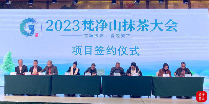 会上,还举行了现场集中签约仪式,共签约茶产业合作项目16个,签约总金额5.39亿元。发布了电影《云在江口》首款海报暨推广歌曲《梵净山抹茶之恋》。《中国抹茶》、贵州大学茶学院、北京吴裕泰茶业相关同志作了交流发言。贵州铜仁贵茶茶业发布了抹茶新产品。