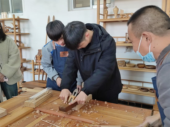 志愿者与学生共同制作木雕工艺品