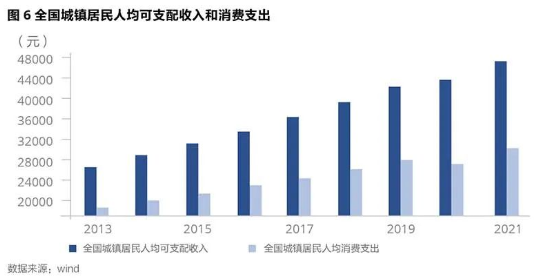 我国城镇居民人均可支配收入不断提升。2013-2021年,我国城镇居民人均可支配收入从26467元增长至47412元,年均增长7.6%;人均消费支出从18488元增长至30307元,年均增长6.4%。持续增长的收入为包括家装家居在内的消费行业带来发展机遇。