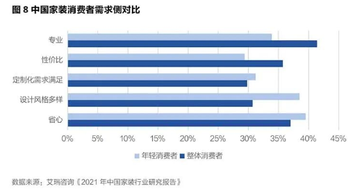 第一,年轻消费者强调便捷,整装成为其偏好装修方式。年轻消费者平均工作时间更长,亲自动手劳动的能力和意愿下降,并且工作生活节奏加快,没有时间和精力处理繁琐零碎、耗时长的装修和家具采购,希望以更省心、更简单的方式进行装修。根据艾瑞咨询《2021年中国家装行业研完报告》,省心靠谱是家装消费者最重要的服务诉求。尤其是年轻消费者,对省心和定制化需求更高。根据生活家装饰联合腾讯家居发布的《2018年中国家居整装设计趋势白皮书》,在装修方式的选择上,仅有20.81%的消费者愿意亲力亲为,自己搞定;39.6%的消费者选择全屋整装,拎包入住。而其中选择拎包入住的80后消费者更是高达43.57%。