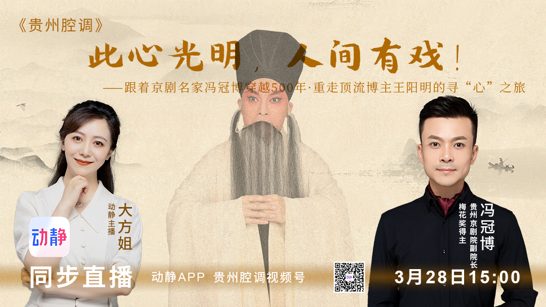 直播预告丨明天15:00,京剧名家冯冠博带你穿越500年,对话顶流博主王阳明 2024-03-27 18:25 从京剧《阳明悟道》到微纪录片《我的1508 问道·十二境》 京剧名家冯冠博带你一起去感受王阳明悟道传道的心路历程洞窥阳明心学的要义和精髓触摸贵州文化发展的脉络 点击图片进入直播↑↑↑ 明天(3月28日)15:00,动静特邀京剧名家冯冠博做客《贵州腔调》,同主持人大方姐一起穿越500年,重走顶流“博主”王阳明的寻“心”之旅! 3月28日15:00动静App动静贵州视频号贵州腔调视频号同步直播 扫描下方二维码或点击海报进入直播页面↓↓↓ 记者: 王青 编辑: 王青 责编: 李佳 编审: 侯莹