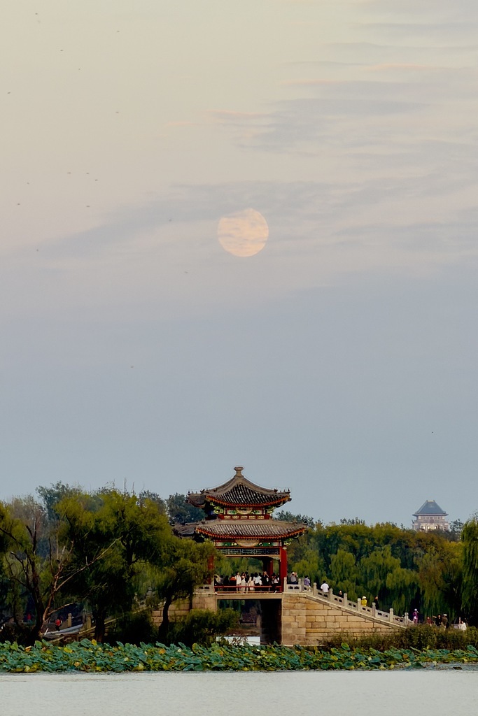 傍晚将至,颐和园练桥之上,一轮圆月已悬在天边,与夕阳遥相对望。