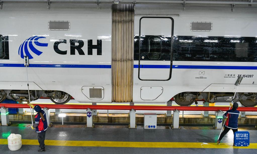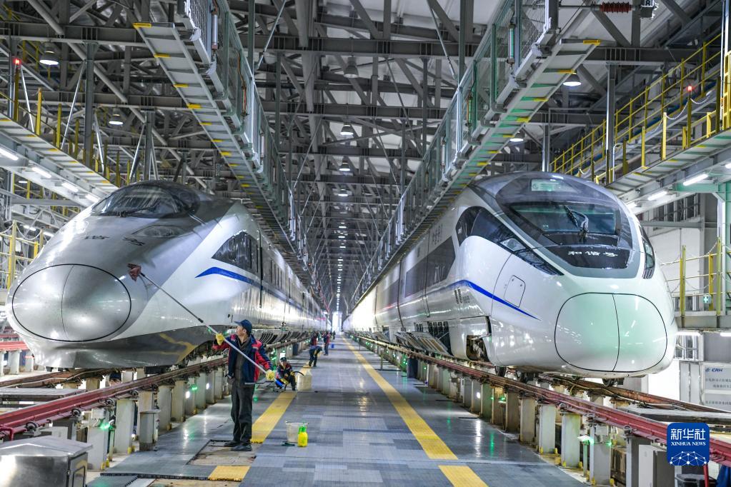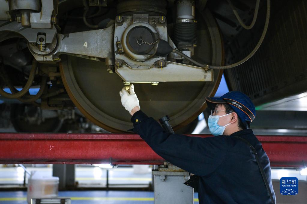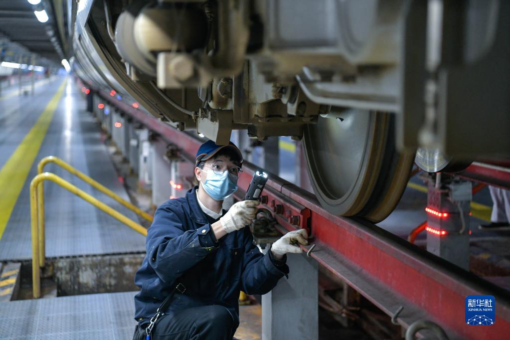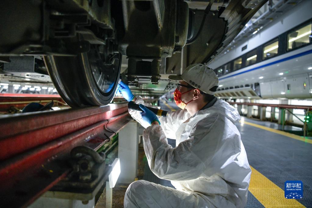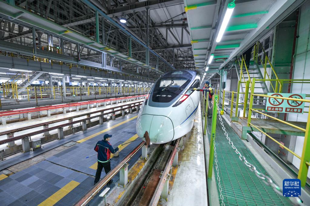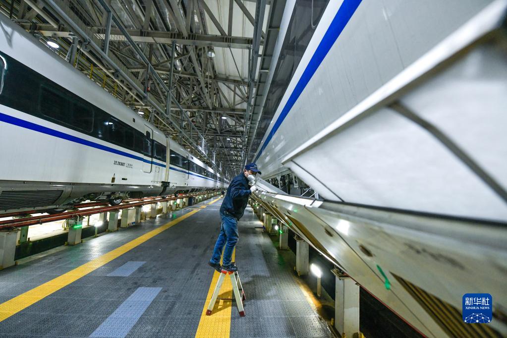2023年春运于1月7日启动。中国铁路成都局集团有限公司贵阳车辆段贵阳北动车运用所的工作人员对动车组列车进行检修、保养、清洁,确保春运期间列车运行安全和旅客乘车环境舒适。