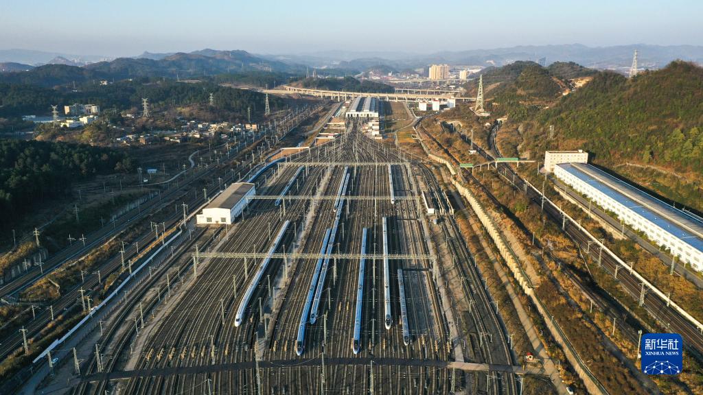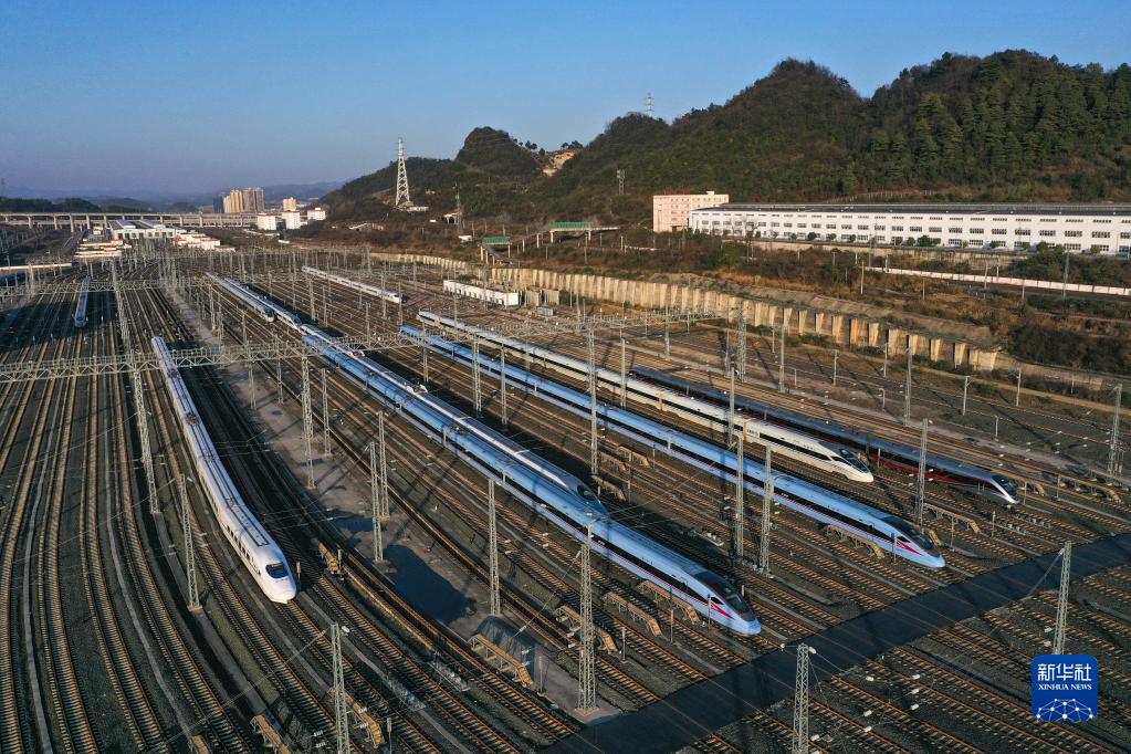 1月6日,检修清洁完毕的动车组列车停靠在贵阳北动车运用所的存车线上(无人机照片)。