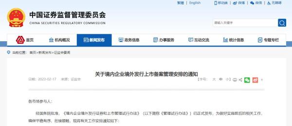 2月17日,中国证监会发布《关于境内企业境外发行上市备案管理安排的通知》。具体内容如下: