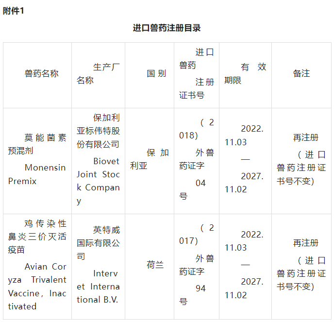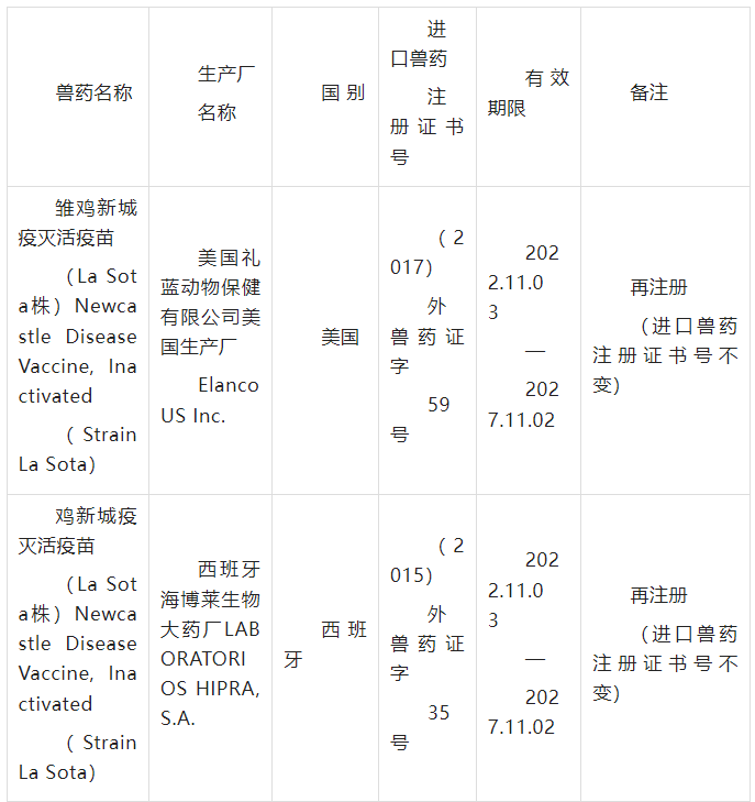 批准英特威国际有限公司等3家公司生产的鸡传染性鼻炎三价灭活疫苗等3种兽药在我国再注册,核发《进口兽药注册证书》,并发布修订后的质量标准、说明书和标签,自发布之日起执行,此前发布的该3种兽药质量标准、说明书和标签同时废止。