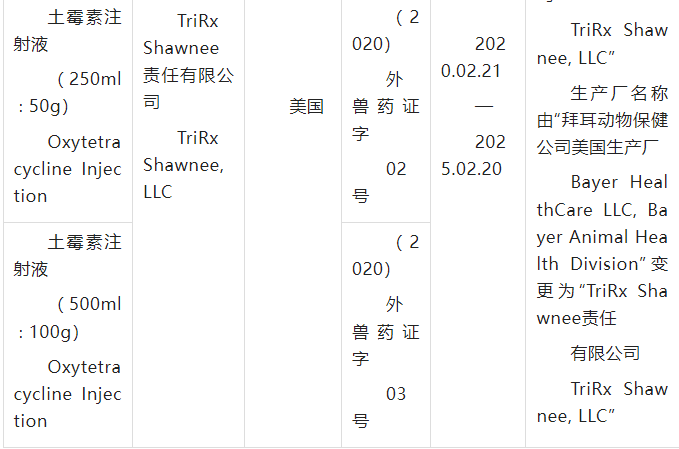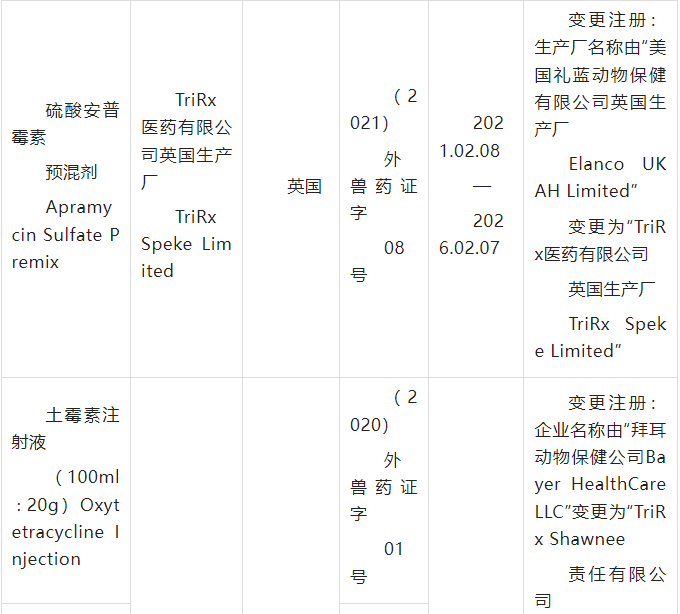 批准TriRx医药有限公司英国生产厂等2家公司生产的硫酸安普霉素预混剂等2种兽药在我国变更注册。