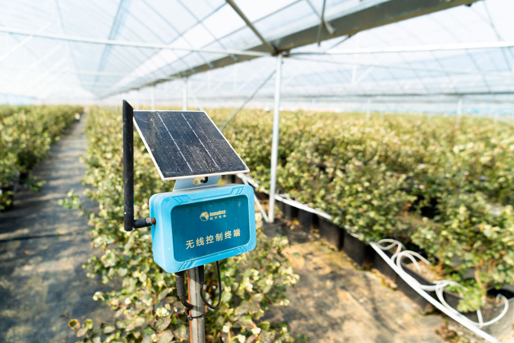 3月19日,5G蓝莓种植基地温室大棚内,无线控制终端正在工作。新华社记者 赵金正 摄
