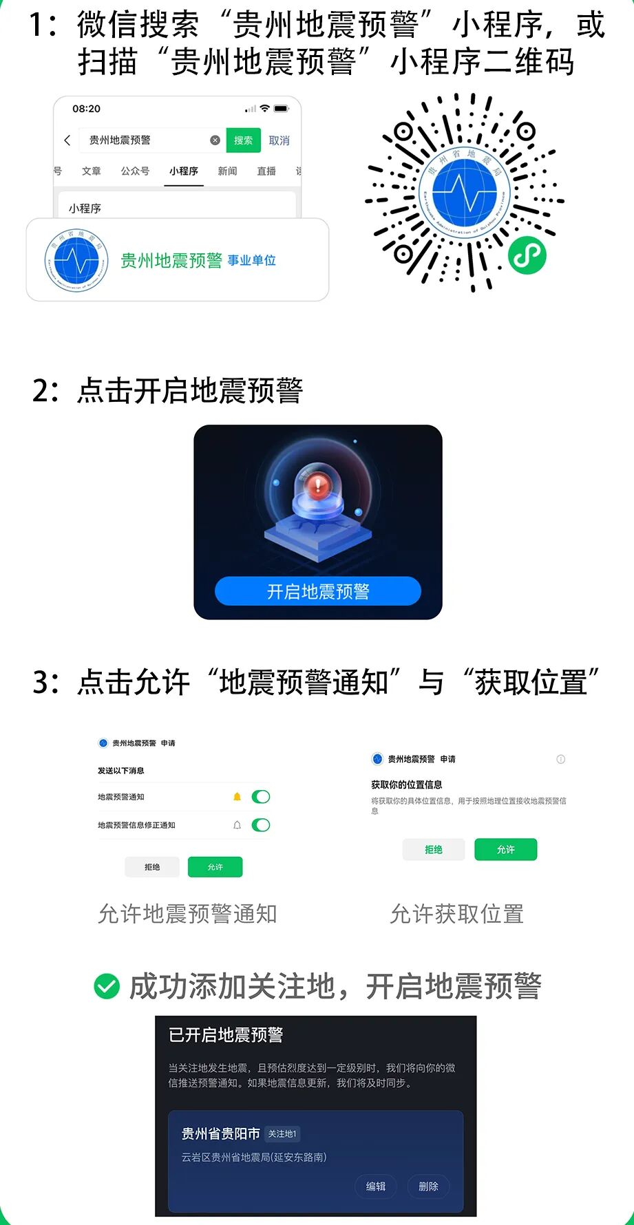 贵州地震预警系统已形成专用终端、微信小程序、IPTV电视应用等多元化信息发布渠道,并与广电、腾讯等平台合作,实现预警信息推送快速、覆盖面广、定位精准!快关注起来,咱们一起守护平安~