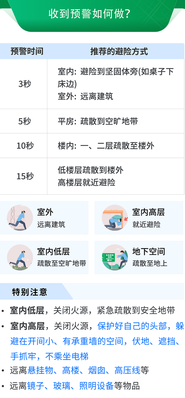 贵州省地震局已经在全省学校、医院、高铁、轨道交通、水库等重点区域,安装了2019台专业地震预警信息发布终端。一旦省及周边50千米范围内发生4.0级及以上地震、100千米范围内发生5.0级及以上地震、300千米范围内发生6.0级及以上地震,无需人为操作,设备会自动发出强烈的声光警报,为大家提供安全警示。