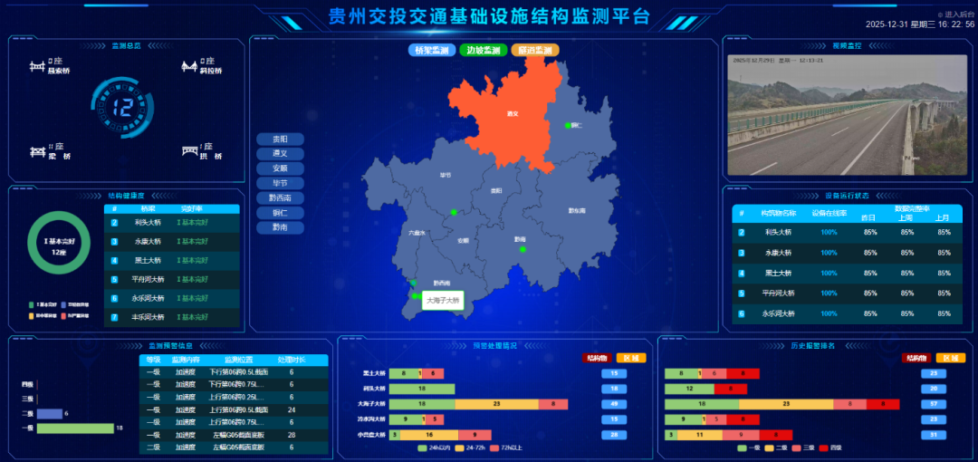 近日,贵州交投集团所属交投研发公司自主研发的交通基础设施结构监测业务平台“黔交智感V1.0”平台正式上线发布,标志着集团交通基础设施管养更加智慧化、精准化,为集团安全管控体系注入了强大的科技数字动能。