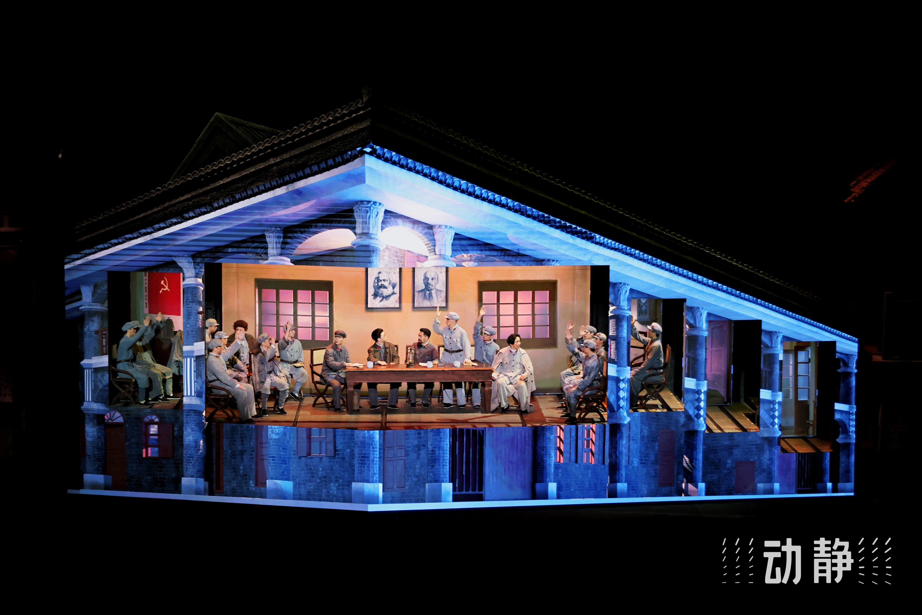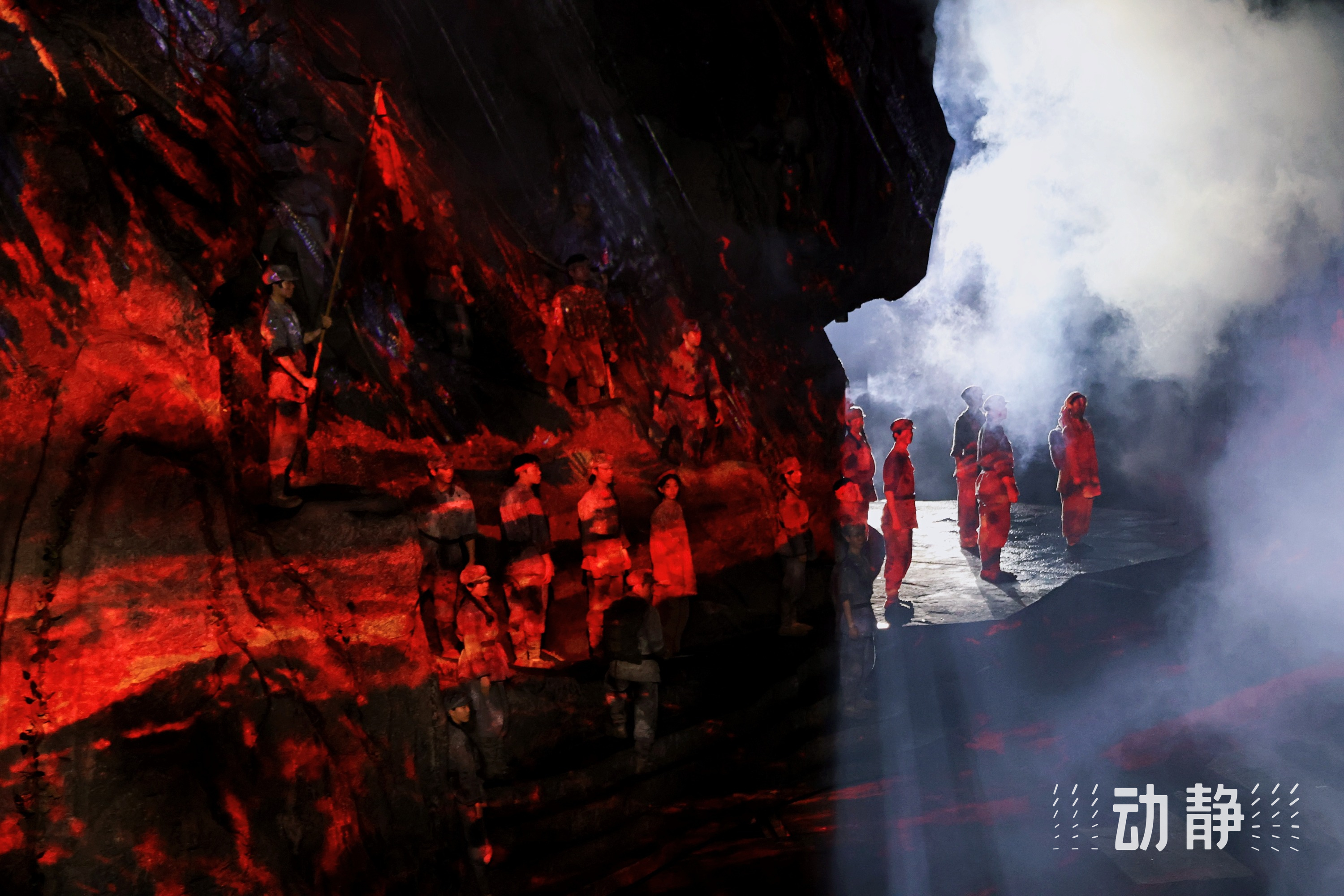9400平方米定制舞台、800吨水循环成河、26米落差瀑布,8D音效声声环绕、360°旋转舞台……声、光、水、电、影、景融合,现场观众们能够与英雄同沐89年前的大雨,以一台剧,再现红色革命史诗,让观众可以跨越时空,“对话”1935。