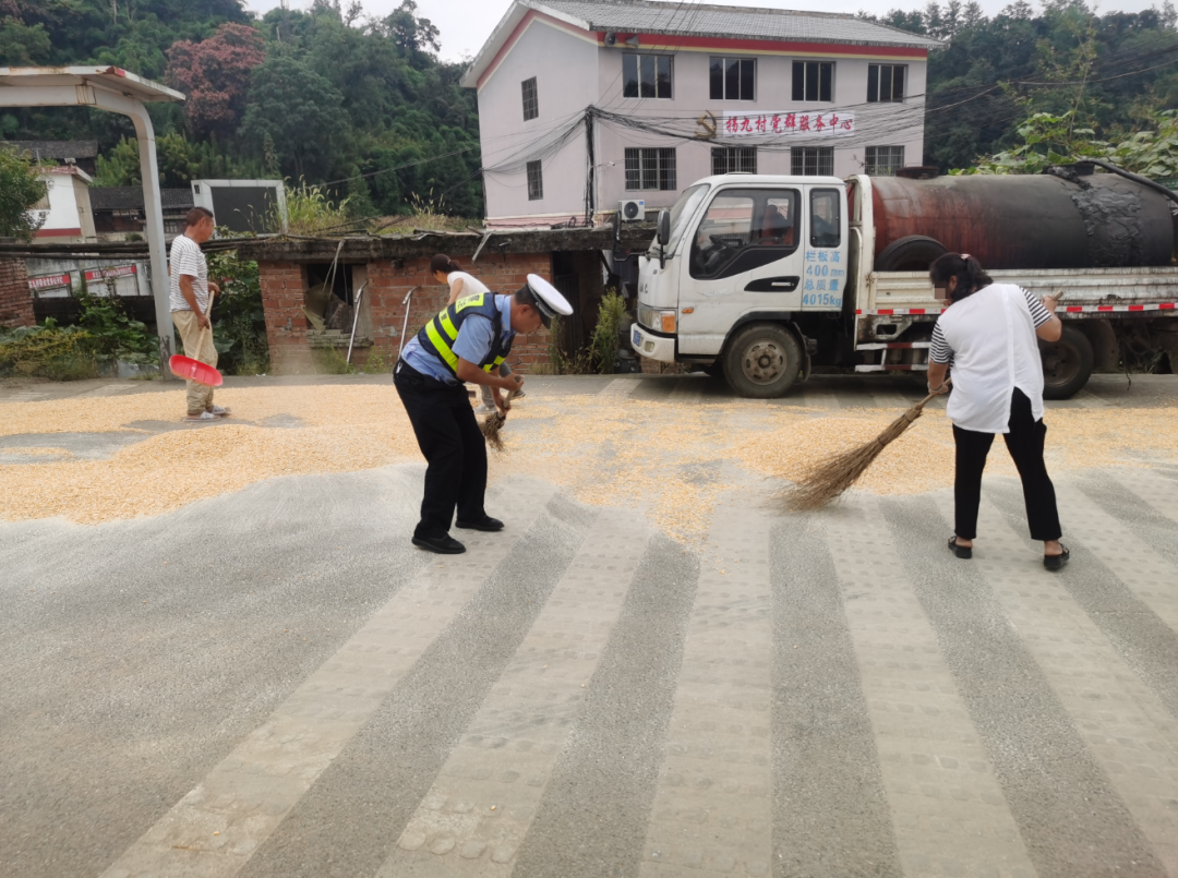 9月5日,贵阳交警乌当区分局四中队组织警力在辖区百宜镇拐九村开展交通宣传工作时,遇见路边一村民家正在马路上晒玉米。