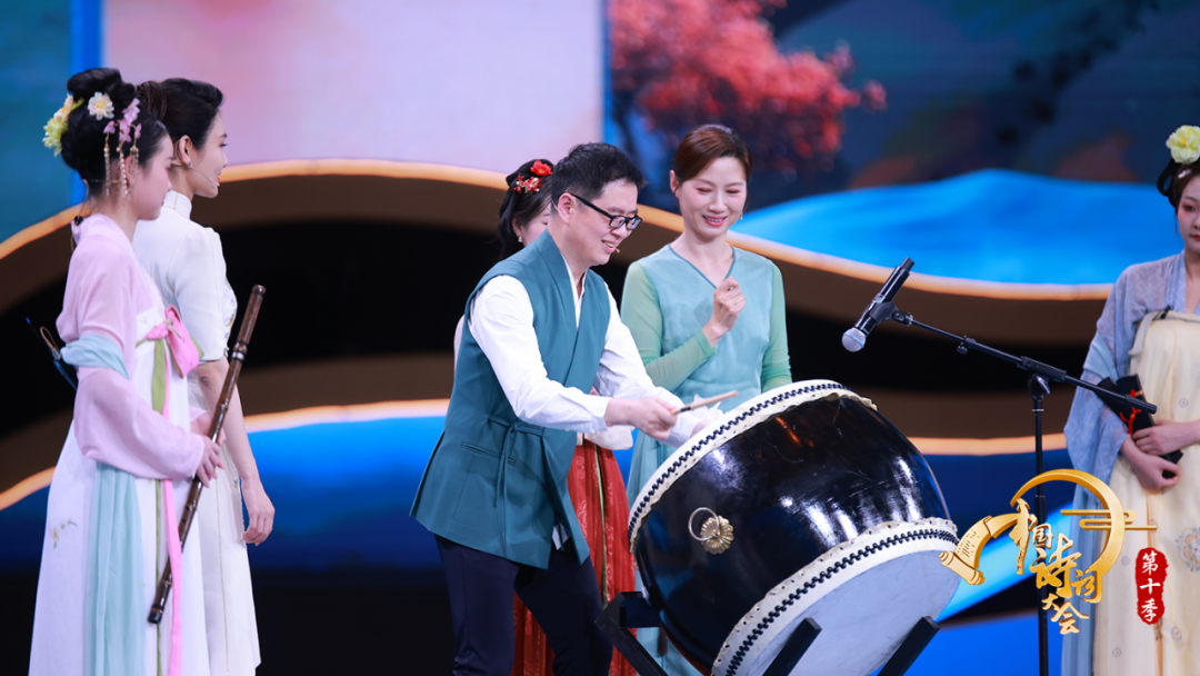 情到深处,郦波老师亲自上阵,摹仿古法击奏建鼓。鼓声雄浑,节奏铿锵,令人恍如亲见千年前礼乐兴盛、金石和鸣的盛大场面。那一刻,鼓不仅是乐器,更成为连贯古今的文化符号,一声一韵,皆是对观众文化记忆的深切唤醒。