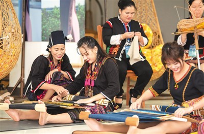 2021年黎锦技艺研修班开班,受到海南省黎族传统纺染织绣从业者欢迎。研修班培训内容包括传统黎锦技艺学习和电子商务、短视频等。图为学员符慧莉(左二)在老师指导下学习织黎锦。