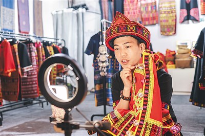 24岁的黄杨伟是海南科技职业大学学生,也是一名黎锦创业者。他出生于海南一个黎族村落,从小就被传统服饰的花纹所吸引。6年前,他在高中“非遗技艺进校园”课堂上开始学习黎锦技艺,如今和表姐一起在五指山市开了一家黎锦服饰店。除了卖黎族服饰,黄杨伟还会不定期线上直播讲解黎锦制品和黎族文化。