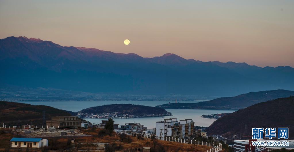 圆月与苍山洱海同框(摄于2月6日)。新华网发(赢光万 摄)