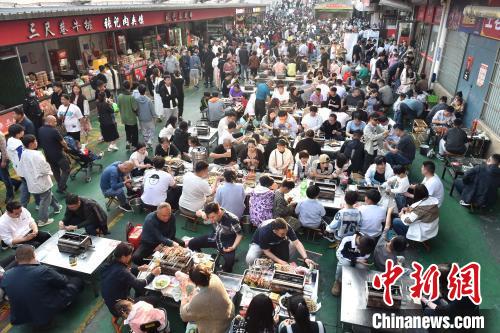 与此同时,柳州开通嗦粉、夜宵美食等公交专线,途经各螺蛳粉"网红店"、各大夜市。"五一"假期期间,柳州设置近200个"宠粉"志愿服务岗、增开柳江水上音乐喷泉场次、扩增行李寄存处等,全方位为游客服务。山东淄博,民众在网红烧烤店牧羊村品尝淄博烧烤。 钟欣 摄