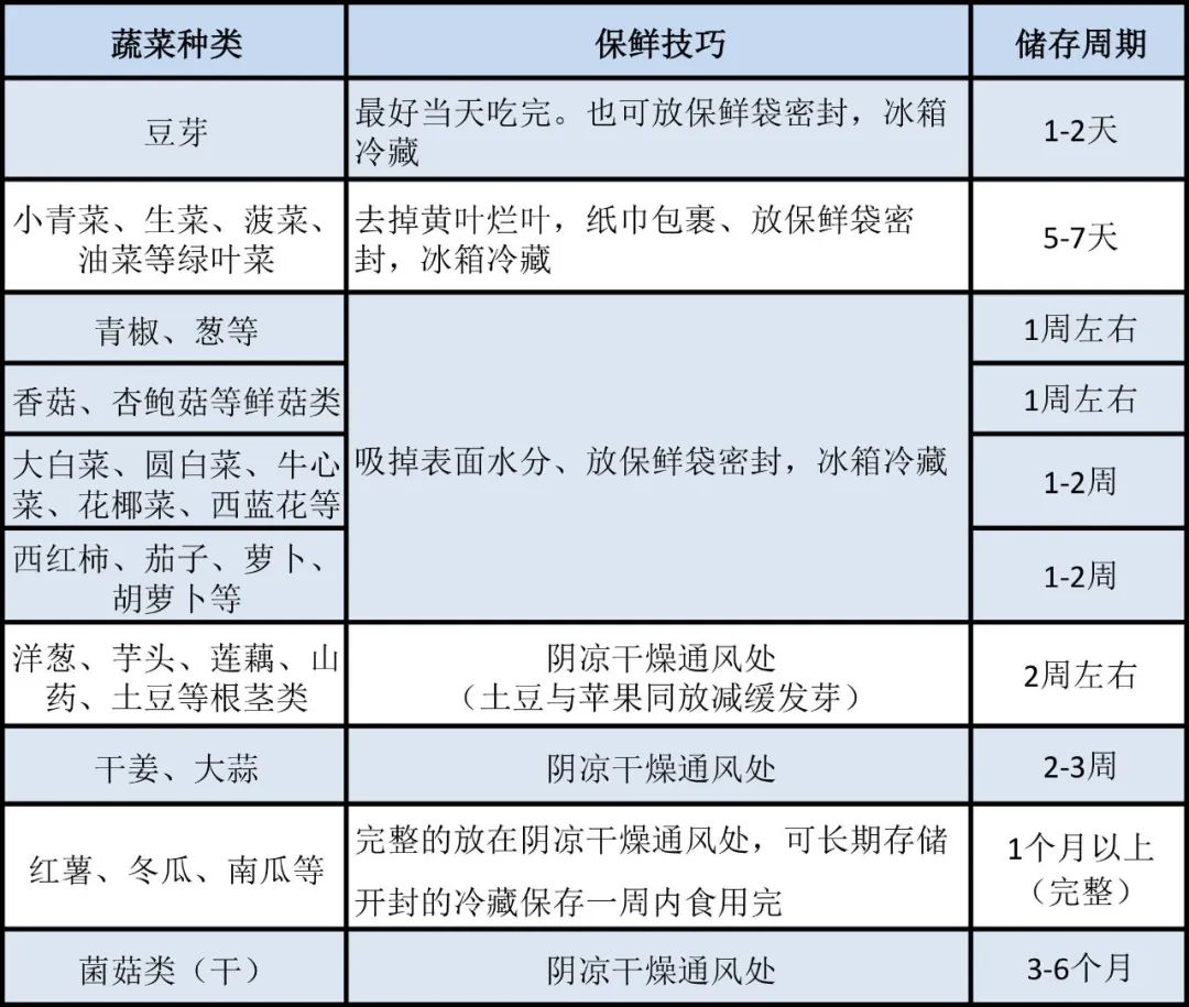 总体上来说水分越少的蔬菜越耐储存,其他未列在里面的蔬菜也可根据表格参照保存。另外,西蓝花、胡萝卜、豌豆、西葫芦等蔬菜如果一个星期内吃不完,可以将蔬菜焯水后晾凉,分装进保鲜袋放入冰箱冷冻。