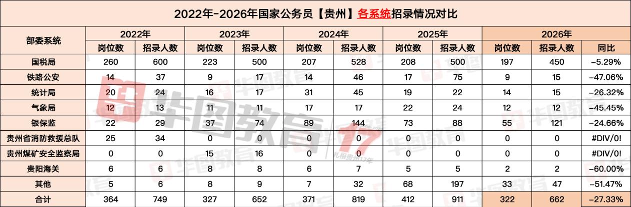 2026 年贵州国考共设322 个岗位,计划招录662 人,较 2025 年同比下降 27.33%。其中,国家税务总局贵州省税务局以 197 个岗位、450 人招录量,占全省岗位数的 61.18%、招录人数的 67.98%,持续领跑各系统;国家金融监督管理总局贵州监管局招录 121 人,占比 18.28%,位列第二。