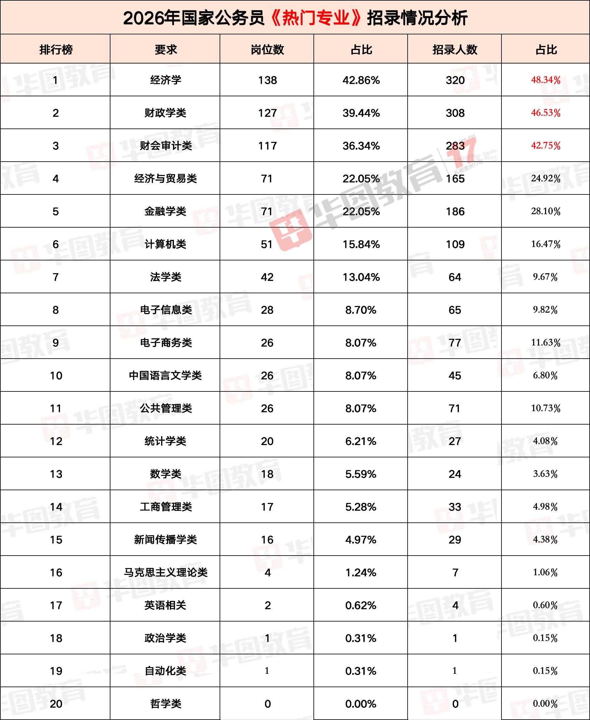 经济学类(岗位 138 个、招录 320 人)、财政学类(岗位 127 个、招录 308 人)、财会审计类(岗位 117 个、招录 283 人)专业需求最集中;计算机类(岗位 51 个、招录 109 人)、法学类(岗位 42 个、招录 64 人)需求稳定,冷门专业如哲学类则无岗位招录。