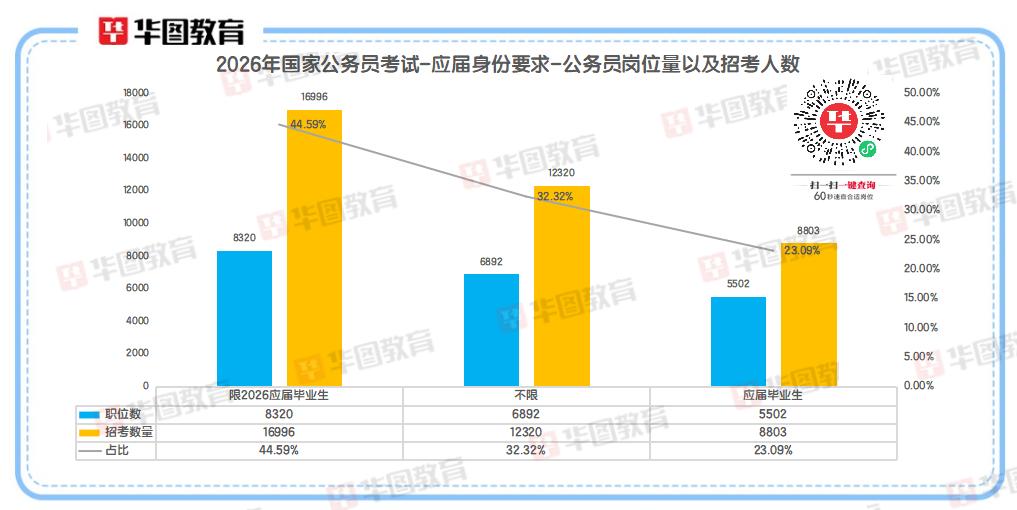 26年国考共计设置20714个职位,招录38119人,同比25年招录人数减少4.3%,较去年减招1602人。其中最受关注的是应届生可报考的岗位,超67%的岗位明确面向应届毕业生开放,应届生的竞争压力会显著低于非应届岗位!