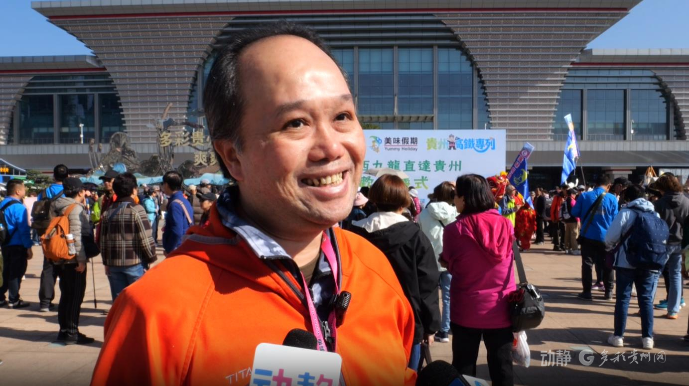 在贵阳北站,看到贵州特色少数民族歌舞和舞狮表演,香港游客李云龙坦言很意外也很开心,欢迎仪式让大家感受到了贵州人民的热情好客,希望旅途也会美好。