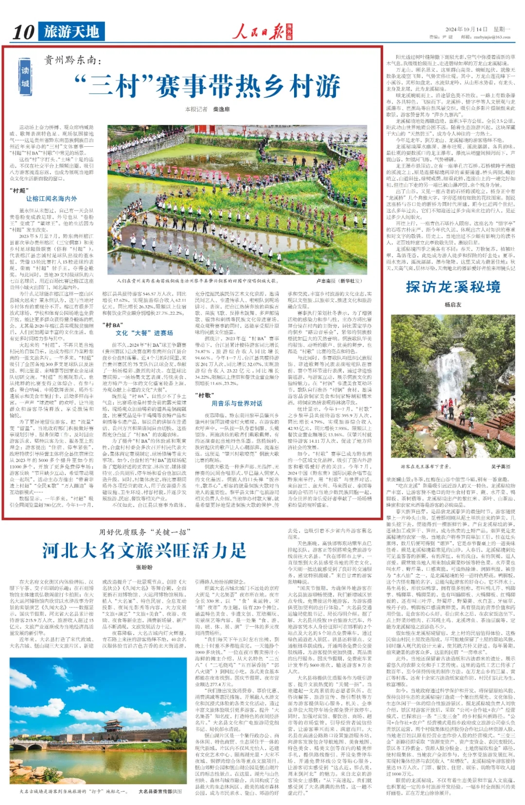 人民日报海外版10月14日刊发文章《贵州黔东南:“三村”赛事带热乡村游》,关注贵州省黔东南苗族侗族自治州近年来举办“三村”文体赛事——“村超”“村BA”“村歌”。这些“村”字打头、“土味”十足的活动,不仅在社交平台上频频出圈,吸引八方游客流连忘返,也成为展现当地群众文化生活新面貌的窗口。