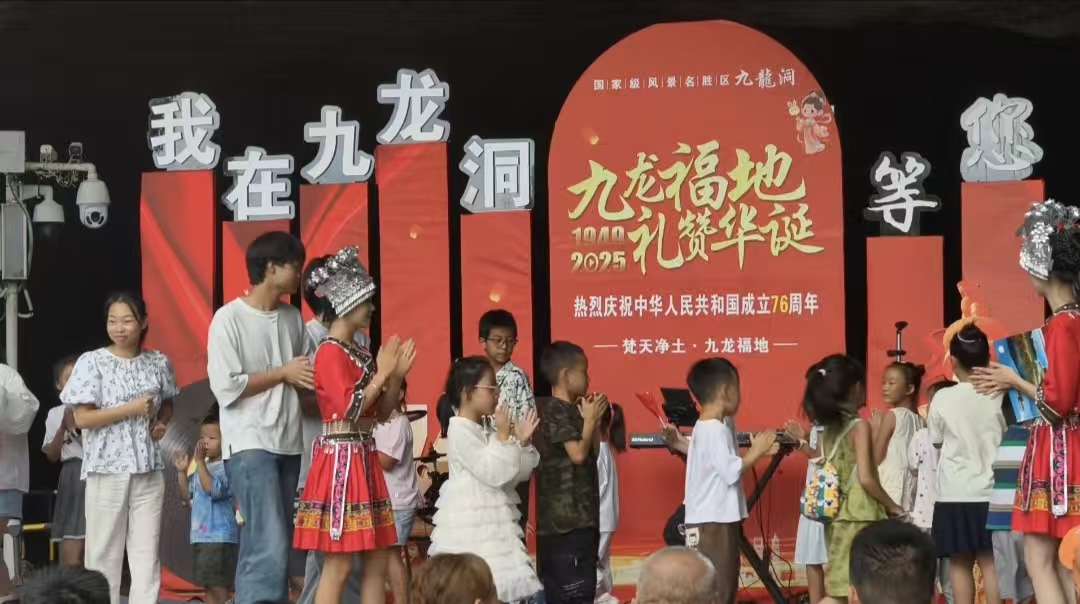国庆期间,为丰富游客的假期游览体验,致敬祖国华诞,九龙洞景区于10月1日至6日隆重推出“九龙福地·礼赞华诞”国庆主题系列活动。本次活动融合自然风光、音乐演出、民族舞蹈、互动体验等,倾力打造一场集视觉、听觉与情感体验于一体的文旅盛宴。