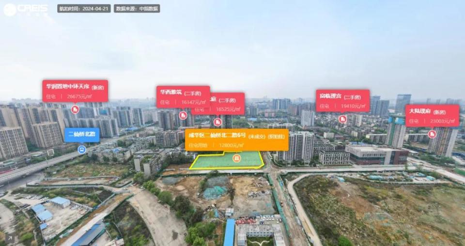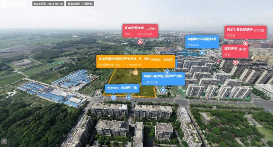 起始总价居于第二位的是编号为JN06(070102):2024-021的金牛区营门口街道茶店子社区2、5、6组花照社区4组地块,起始总价为17.75亿元。最终,眉山海纳房地产开发有限公司以17.97亿元的总价竞得,溢价率为1.25%,成交楼面价16200元/平方米。