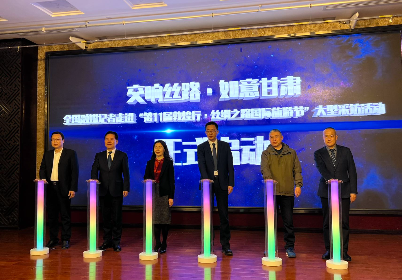仪式现场,甘肃省广电总台交通广播副总监刘前勇、敦煌市融媒体中心主任李国辉向采访活动记者团代表授团旗,并与现场出席领导共同启动“交响丝路•如意甘肃”——全国融媒记者走进“第11届敦煌行·丝绸之路国际旅游节”大型采访活动。