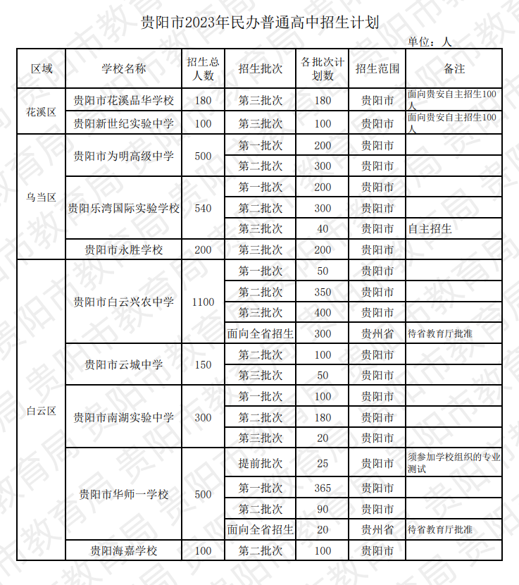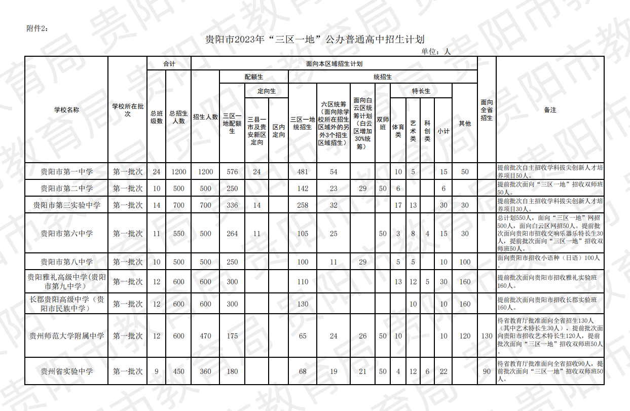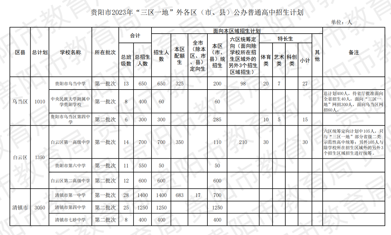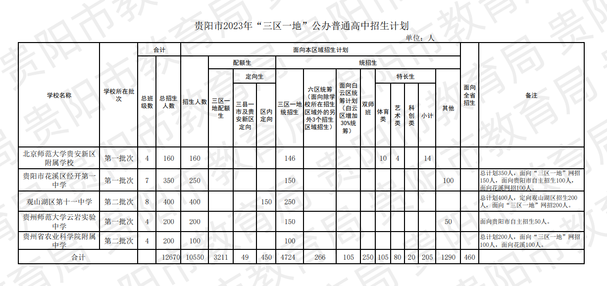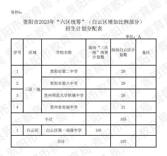 白云区属公办省级示范性普通高中增加的30%的统筹计划只与“三区一地”进行统筹。白云区属公办省级示范性普通高中统招生招生计划中新增加的30%,面向“三区一地”招生;“三区一地”的省级二类示范性普通高中学校(贵阳市第二中学、贵阳市第八中学、贵州师范大学附属中学、贵州省实验中学)划出等额的招生计划面向白云区招生。