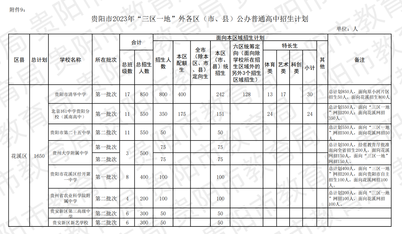 2023年花溪区、乌当区、白云区各区属公办省级示范性普通高中统招生计划的30%,面向本招生区域以外的“三区一地”和另两个招生区域招生;“三区一地”有配额生招生计划的普通高中学校(除贵阳雅礼高级中学<贵阳市第九中学>和长郡贵阳高级中学<贵阳市民族中学>外)和另两个招生区域内的公办省级示范性普通高中,共划出等额的招生计划面向该区招生。
