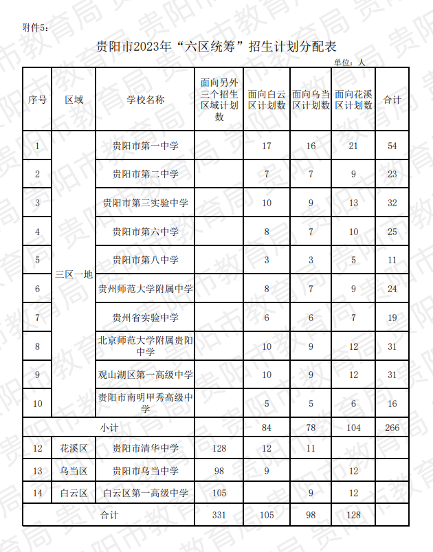 “六区统筹”定向:即云岩区、南明区、观山湖区、花溪区、乌当区、白云区六个城区的招生统筹,2023年在维持原来统筹比例的基础上,将白云区区属公办省级示范性普通高中的统筹比例提升至60%。