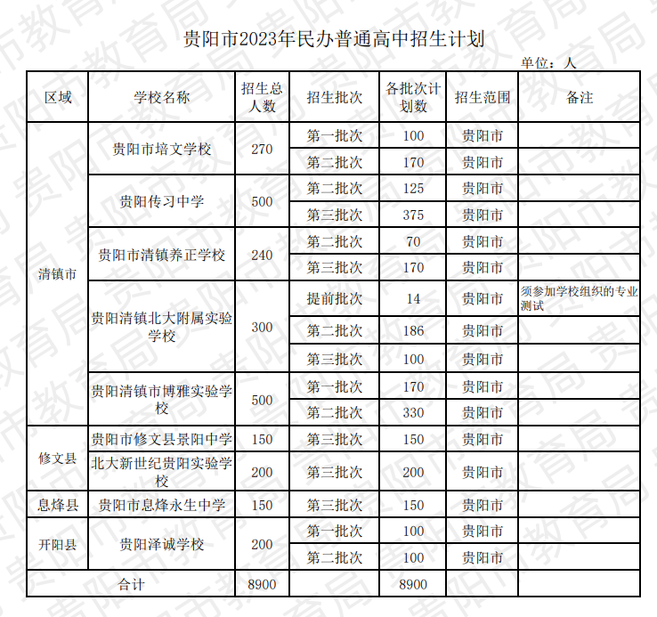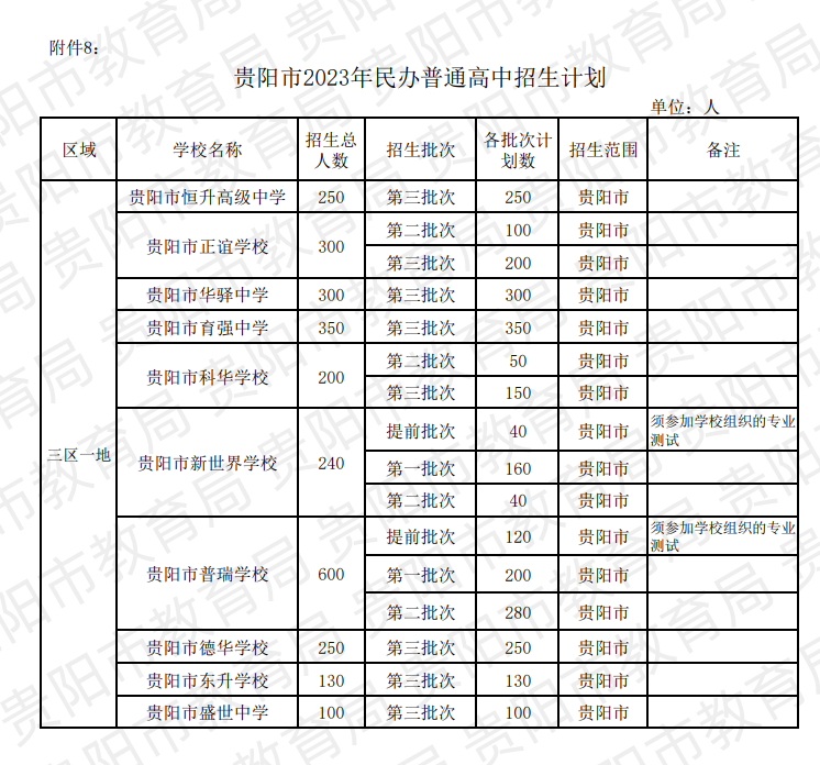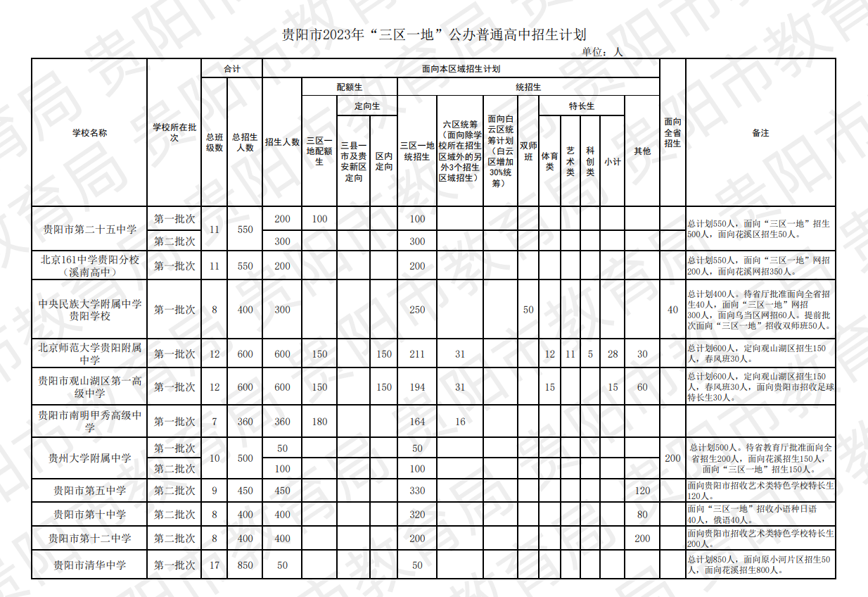 除上述招类别外,省教育厅批准可以面向全省招生的学校,由学校在招生计划内自主招生,招收学生的中考总成绩必须达到生源地同类招生学校的录取控制线。根据县域高中振兴行动计划相关要求,市级教育发展联盟龙头校在本联盟内各成员校分别开设1个县域高中振兴班,面向成员校所在招生区域招生,单独编班,提升县域高中质量。在贵阳市第二中学、贵阳市第六中学、中央民族大学附属中学贵阳学校、贵州师范大学附属中学和贵州省实验中学分别开设1个双师班,纳入提前批次招生,单独编班。