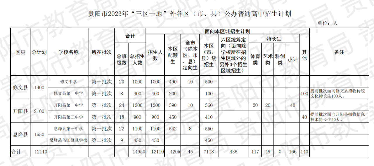 今年,贵阳市普通高中招生计划含五种类别的招生,即:配额生、统招生、定向生、特长生、政策生。